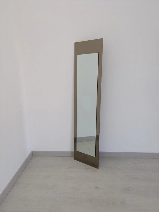 L'elemento chiave di questa specchiera è la sua cornice integrata, realizzata in un materiale che presenta una tonalità scura, quasi un bronzo fumé o un grigio antracite, con una finitura leggermente traslucida o affumicata. Questo dettaglio conferisce al pezzo un'eleganza sottile e una profondità inaspettata, permettendo al contempo alla luce di giocare con i riflessi in modo discreto.