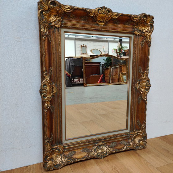Aggiungete un tocco di classe regale ai vostri interni con questo splendido specchio barocco antico. La robusta cornice in legno cattura immediatamente lo sguardo con le sue ricche e dettagliate incisioni. Eleganti riccioli e ornamenti floreali adornano gli angoli, mentre le calde tonalità oro e bronzo creano un look lussuoso. Lo specchio trasuda storia. Sottili imperfezioni nella finitura e la profonda patina conferiscono a questo pezzo un irresistibile carattere vintage. Sono proprio questi dettagli vissuti a rendere l'oggetto autentico e unico. Collocate questo pezzo forte nell'ingresso per un benvenuto maestoso o usatelo come elegante elemento decorativo sopra una credenza vintage. Questo specchio da parete brocante si abbina senza sforzo sia ad interni classici che eclettici! Lo specchio è anche rimovibile, permettendovi di utilizzare la cornice per le vostre opere d'arte. Data la sua età, lo specchio potrebbe presentare alcune imperfezioni, che ne accrescono il carattere. Dimensioni