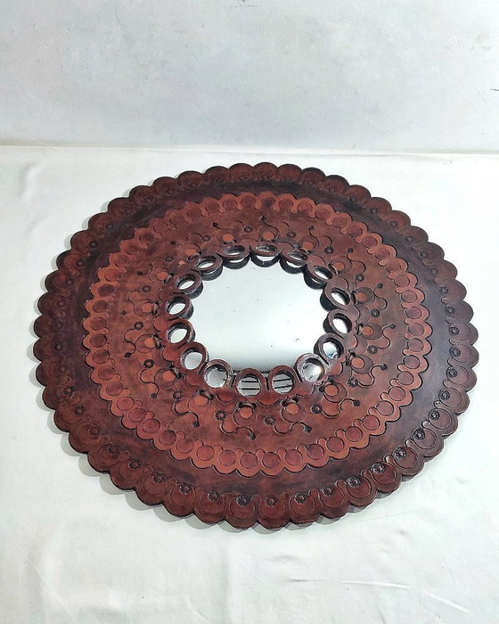 Specchio circolare convesso in pelle. Spagna, anni '70.