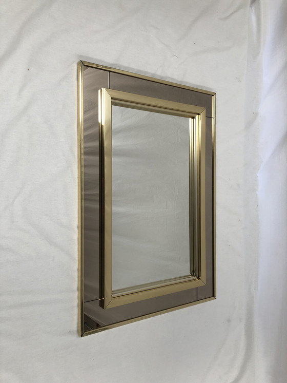 Specchio dal design vintage progettato e prodotto da Belgo Chrom (BE) negli anni '70. Rettangolare con vetro fumé e ottone. Minimi segni di usura!