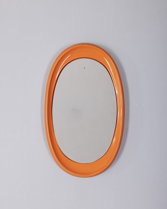 Specchio da parete ovale con cornice in plastica arancione, design Italiano, anni 70.