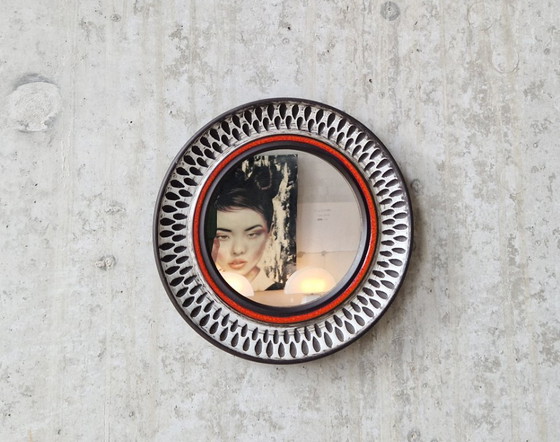 Piccolo ma bellissimo specchio da parete a forma di piatto. La base in ceramica (il bordo del piatto) presenta un bellissimo motivo a graffito e un bordo arancione scuro all'interno. In eccellenti condizioni vintage e con il sistema di aggancio in metallo originale. Prodotto in Scandinavia, anni '70.