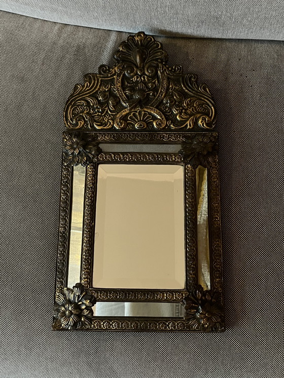 Piccolo specchio antico dorato. Doppia cornice bisellata con specchi intarsiati, vetro antico a specchio invecchiato, sfaccettato al centro. Con stemma decorativo. Specchio antico olandese a cuscino - XIX secolo, specchio bisellato in ottone e legno sbalzato - stile Luigi XVI, specchio da sposa in ottone - specchio da sposa vintage Materiali: ottone, vetro, legno, metallo Bellissimo specchio da sposa antico francese in condizioni originali con un'affascinante patina. Dettagli in ottone sbalzato molto attraenti su cornice in legno. In ottime condizioni con segni di usura, vetro invecchiato e un'affascinante patina coerente con l'età. Si prega di considerare le immagini come parte integrante delle descrizioni. Fatto a mano in Francia/Olanda, fine del 1800. Un classico decoro da parete che aggiungerà un tocco di stile a qualsiasi interno affascinante! Dimensioni: 52 x 27 cm