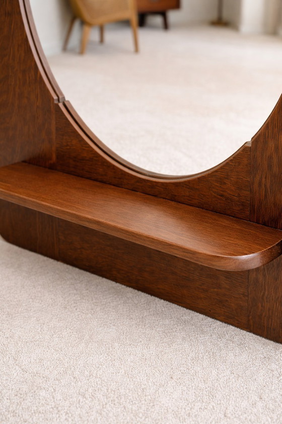 Scopri l'eleganza senza tempo di questo specchio da parete di metà secolo, un capolavoro di design degli anni '50 e '60. Con il suo caldo legno scuro e le venature distintive, questo specchio aggiunge un tocco di raffinatezza a qualsiasi ambiente. Gli angoli arrotondati e la superficie ovale dello specchio con una sottile profilatura enfatizzano il design elegante senza dettagli superflui.
