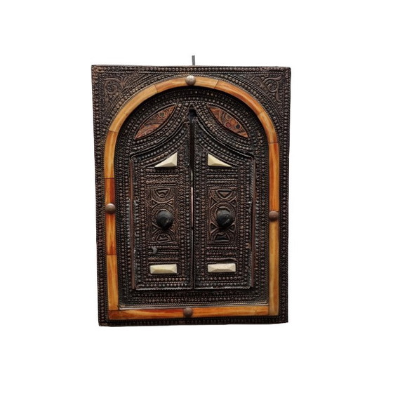 Specchio vintage marocchino con intarsi in osso, risalente alla metà del XX secolo. Realizzato a mano in legno e ottone, questo pezzo da parete unico nel suo genere ha carattere.