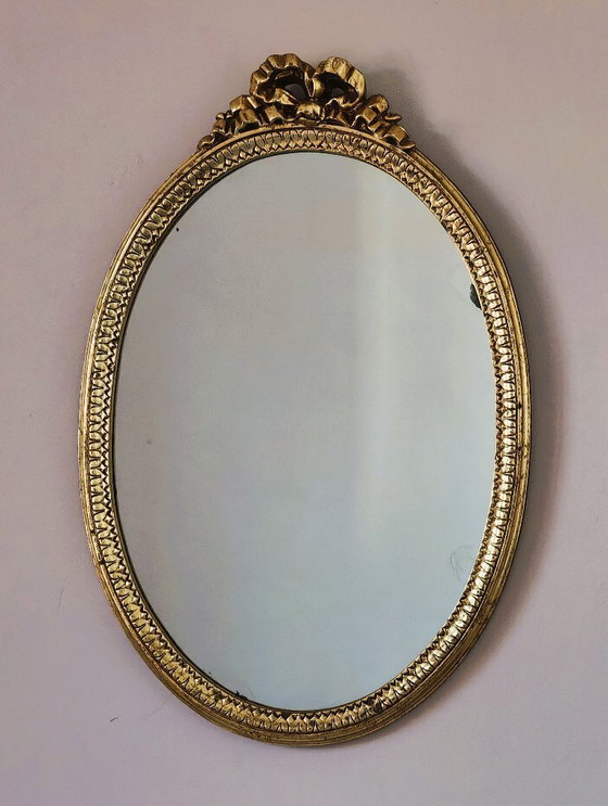 Magnifico specchio ovale antico con cornice in legno intagliato e dorato, riccamente decorato con motivi a rilievo.