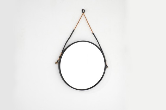 Specchio rotondo vintage in metallo verniciato nero opaco, sospeso con un cordino in cuoio.