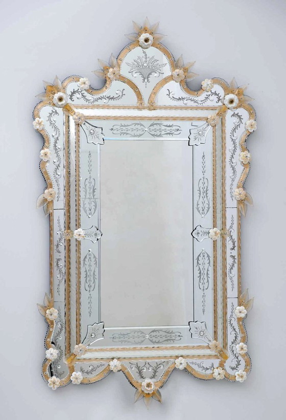 Si tratta di un delizioso specchio classico veneziano dell'isola di Murano in color oro con finitura floreale in oro bianco, inciso e lavorato interamente a mano secondo la tradizione muranese, con parti arrotondate e incise a mano negli angoli. Uno specchio lussuoso per arredamenti di lusso, di fine '900.