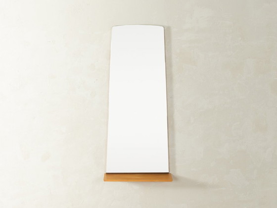 Semplice specchio da parete vintage che unisce estetica minimalista e funzionalità pratica. Il design degli anni '50 riflette il linguaggio stilistico pulito del design di metà secolo e colpisce per la sua forma quasi senza cornice su tre lati. La mensola in legno marrone chiaro nella parte inferiore aggiunge un tocco di calore e offre un elegante spazio per piccoli oggetti di uso quotidiano. Restaurato con cura e conservato in ottime condizioni, lo specchio testimonia una solida fattura artigianale.