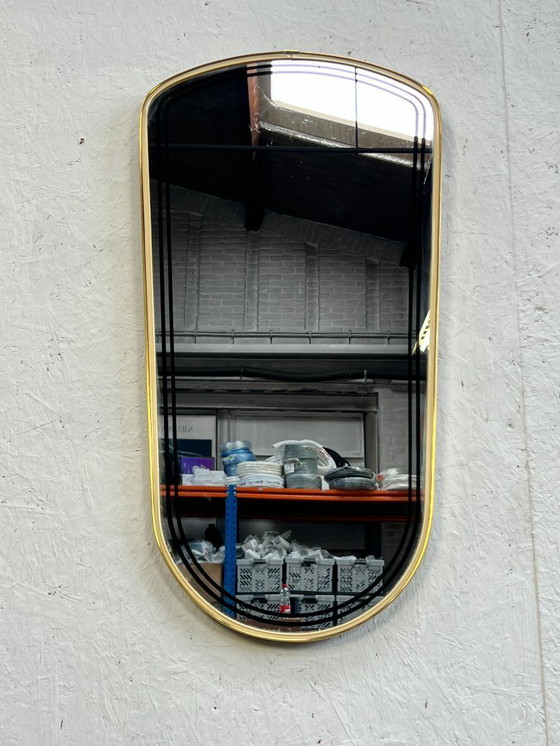 Uno splendido ed elegante specchio vintage con bordo in plastica dorata. Lo specchio ha una forma organica con angoli arrotondati. Il vetro dello specchio presenta doppie linee nere lungo i bordi. È dotato di un sistema di aggancio sul retro. In buone condizioni, con lievi segni di usura dovuti al tempo.