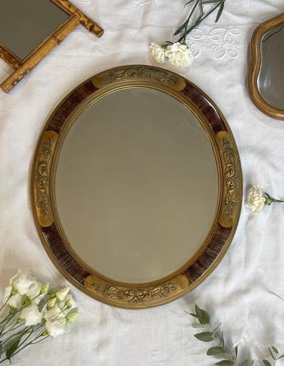 Elegante specchio ovale vintage. Realizzato in legno e gesso dorato, risalente alla metà del XX secolo, questo specchio emana eleganza, classe e carattere. La cornice ovale, finemente decorata, può essere appesa verticalmente o orizzontalmente.