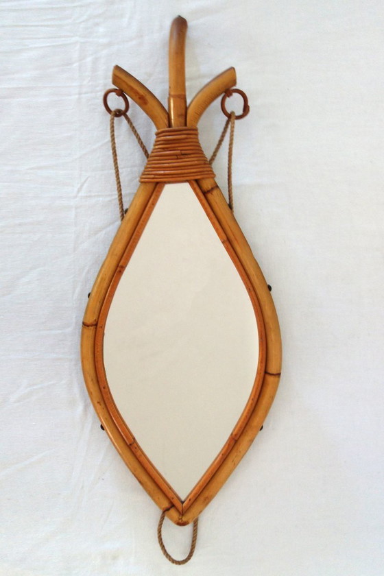 Specchio antico in rattan e bambù degli anni '50 e '60. Decorazione a corda. Condizioni molto buone. Lievi difetti sullo specchio (vedi foto).