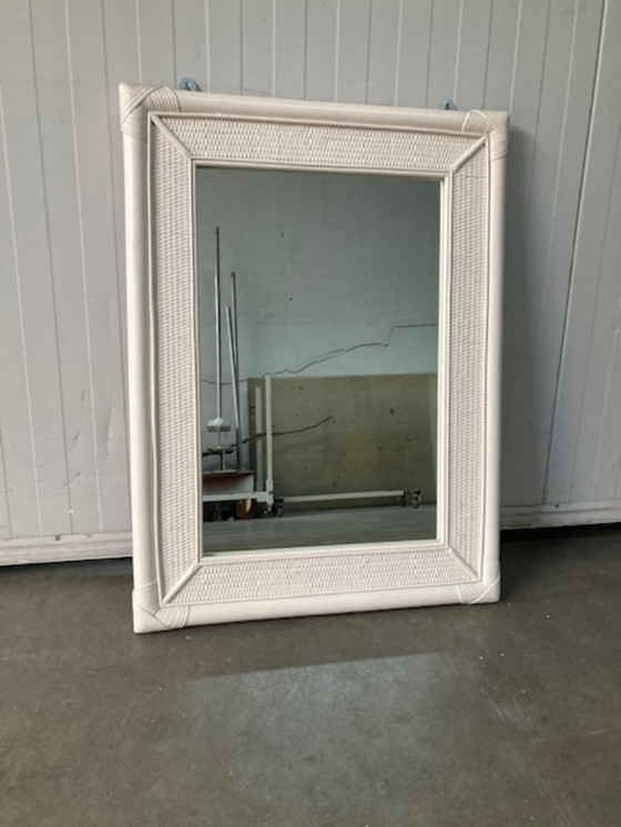 Splendido specchio in bambù e rattan di colore bianco sporco. Prodotto in Italia. In ottime condizioni. Già predisposto per essere appeso alla parete. Dimensioni L 60 cm x H 80 cm
