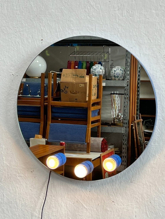 Specchio vintage, metallo blu, con illuminazione. Italia anni '90