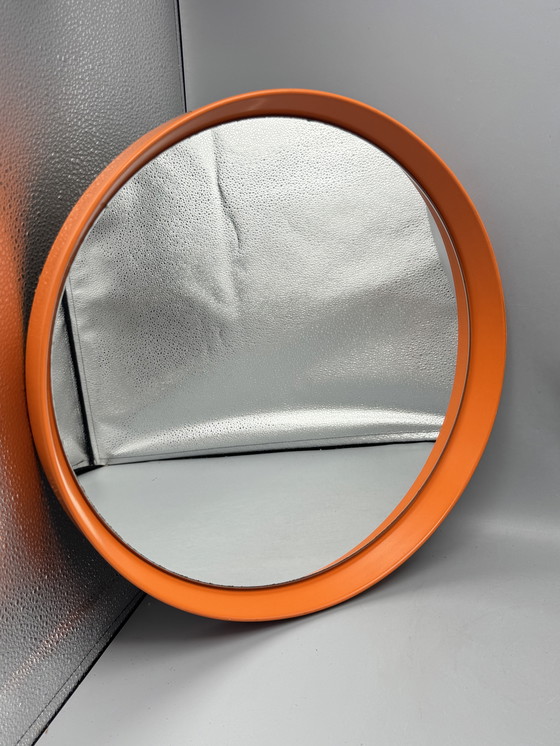 Lo specchio ha una robusta cornice in plastica di un vivace arancione, un colore tipico dell'epoca che aggiunge un'immediata atmosfera retrò a qualsiasi interno. Perfetto per ravvivare una parete spenta o per dare un tocco di glamour spaziale al corridoio, alla camera da letto o al soggiorno.