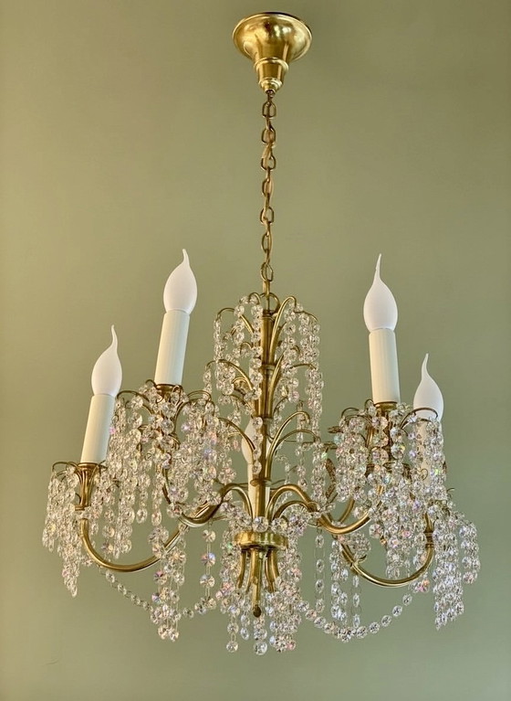 Un raffinato lampadario in cristallo Swarovski di metà secolo, realizzato in ottone dorato e riccamente decorato con perle e pendenti in cristallo Swarovski sfaccettato (Swarovski). I bracci elegantemente curvi e la struttura in cristallo multistrato conferiscono a questa lampada un aspetto elegante e classico, con un lussuoso gioco di luci.