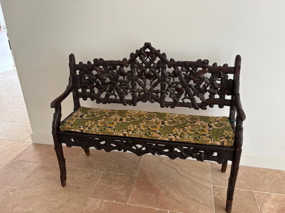 Questa splendida panca della Foresta Nera del XIX secolo è un magnifico esempio di artigianato dell'epoca. Riccamente intagliata con motivi di tralci di vite e foglie, questa panca è stata realizzata a Brienz, in Svizzera. Con i suoi dettagliati intagli e le ricche tonalità scure del legno, questa panca aggiunge un tocco di eleganza e storia a qualsiasi ambiente. Il cuscino verde a motivi floreali offre non solo comfort, ma anche un tocco di colore e consistenza.
