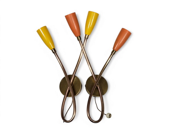 In vendita due graziose lampade da parete Sputnik a 2 luci nei colori arancione e giallo, risalenti agli anni Cinquanta.