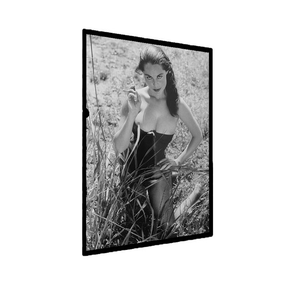 Ritratto d'epoca di Diane Webber di Russ Meyer, Playboy 1956 - Splendida fotografia originale, stampa d'argento d'epoca. Timbro sul retro. Appena incorniciata, secondo le regole dell'arte, con anello in legno nero opaco e vetro antiriflesso. Russ Meyer, regista, sceneggiatore e fotografo americano, è noto principalmente per i suoi film di sexploitation, alcuni dei quali sono diventati classici di culto. Nel 1955, due anni dopo la creazione della rivista Playboy, la Playmate del mese di giugno fu una certa Eve Meyer fotografata dal marito. Diane Webber posò due volte come playmate per la rivista Playboy con il suo nome da nubile Marguerite Empey, nel maggio 1955 e nel febbraio 1956. Questa fotografia è del secondo servizio. Russ Meyer fa parte della stirpe dei più grandi della fotografia erotica come Avedon, Bailey, Barbieri, Blumenfeld, Bourdin, Demarchelier, Donovan, Faurer, Fontana, Giacometti, Gibson, Hiro, Ionesco, Kane, Lagrange, Mapplethorpe, Newman, Newton, O'Neil, Penn, Rawlings, Watson, Webber, Yeager... e tanti altri. • Descrizione: Stampa ai sali d'argento d'epoca, foto originale. • Fotografo: Russ Meyer [1922-2004] • Titolo: Marguerite Empey, febbraio 1956 • Tecnica: Ripresa e stampa ai sali d'argento • Anno: 1956 • Firma: Timbro sul retro • Condizioni: Molto buone • Dimensioni della stampa: 25,5 cm x 20,5 cm