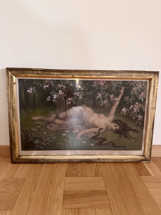 Immagine classica incorniciata di una donna con un serpente. Non ha data, ma è antica. Vedere il retro per farsi un'idea delle condizioni; la stampa è in buone condizioni per la sua età. La cornice presenta patina. Può essere ritirata presso Utrechtse Heuvelrug o Vught.