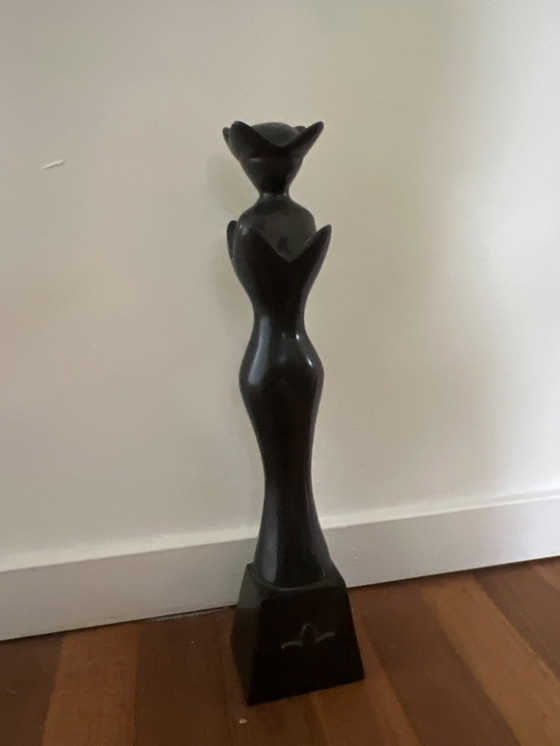Elegante scultura in bronzo dal design astratto. La statua ha una forma elegante e slanciata e poggia su una base quadrata. La superficie in bronzo scuro le conferisce un aspetto sofisticato e senza tempo, perfetto per qualsiasi interno. Questa opera d'arte è una splendida aggiunta per gli amanti dell'arte moderna e astratta. L'artista è Mary True