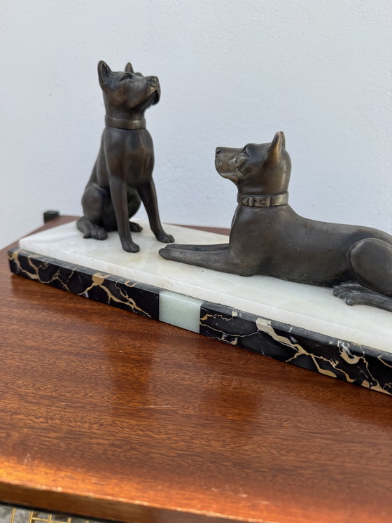 Splendida composizione in stile Art Déco raffigurante due cani in lega di zinco su una base in marmo tricolore; ottime condizioni generali (bella patina dovuta all'età).