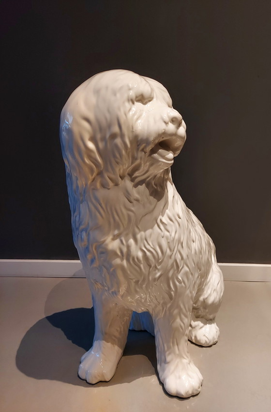 Splendida e grande opera d'arte in porcellana italiana. Questa statua di cane d'epoca è alta ben 70 cm. La statua presenta alcune zone di smalto mancante e la zampa anteriore destra presenta una crepa riparata (vedi foto). Per il resto, è in buone condizioni e ha una splendida lucentezza che le conferisce il suo aspetto vintage. Un timbro di produzione è presente sul fondo. È larga 30 cm e lunga 50 cm. Solo per collezione.
