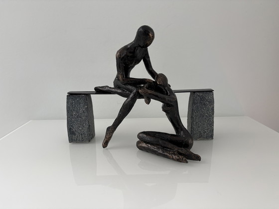 Scultura moderna raffigurante due figure in un ambiente riconoscibile vicino a una panchina. L'uomo sulla panchina sembra confortare la donna seduta a terra. La scultura simboleggia l'amore e la vera amicizia.