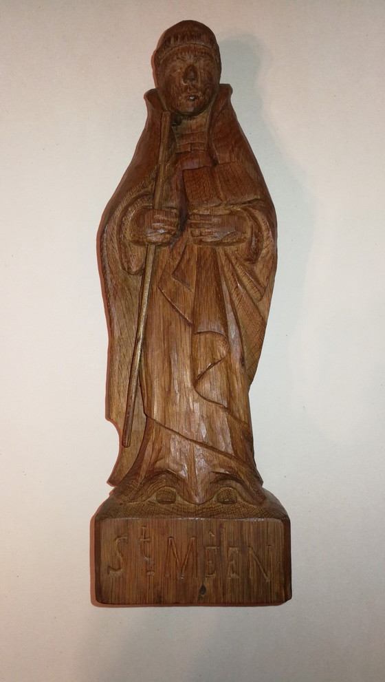 Statuetta antica vintage in legno massello intagliato dell'abate St Méen / anni '50