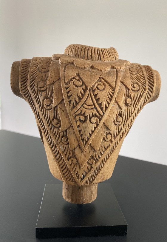 Statuetta di legno splendidamente intagliata raffigurante una corazza, alta 17 cm. La statuetta è realizzata a mano e presenta motivi dettagliati. La statuetta poggia su una base di metallo nero, che la rende un'aggiunta straordinaria a qualsiasi interno.