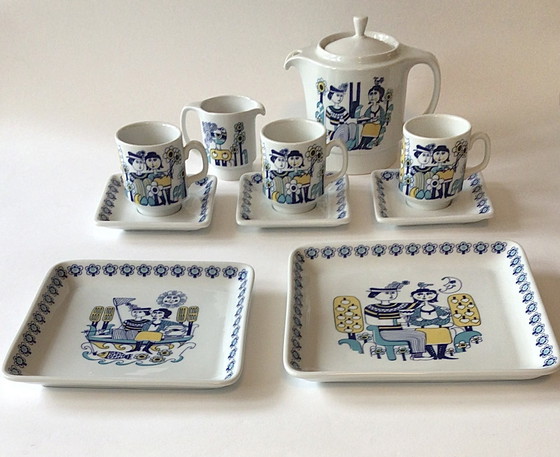 Servizio da tavola Sonja con decori Jeunesse. Disegnato da Jef Schijns. Raffigura un uomo e una donna in barca, tra meli e fiori. Prodotto da Mosa Maastricht intorno al 1960. Materiale: porcellana. In ottime condizioni. 3 tazze e 3 piattini, altezza tazza 7 cm, diametro 6,5 cm. Una lattiera, altezza 6,5 cm, diametro 6 cm. Una teiera/caffettiera, altezza 14 cm, diametro 10 cm. Due ciotole, 19 x 19 cm e 22 x 22 cm.