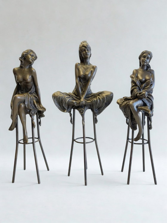 Un elegante set di tre sculture in bronzo raffiguranti figure femminili sedute su snelli sgabelli, ciascuna firmata "Collinet" e recante il marchio "Bronze BJIB Garanti" (Bronzo Garantito BJIB).