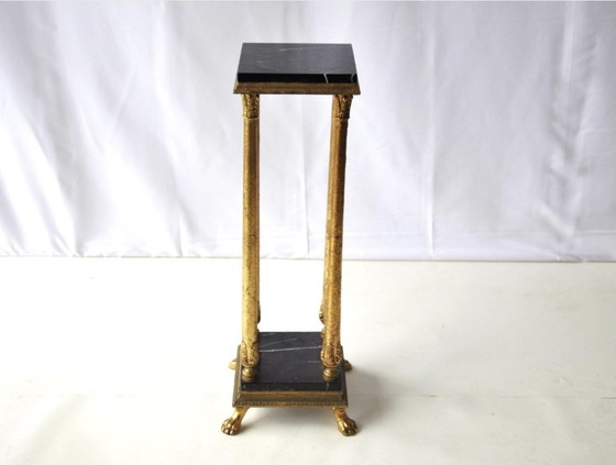 Questo antico supporto d'arte è un elegante supporto per piante dall'aspetto classico. Ha una struttura in metallo color oro con finiture dettagliate e un piano in marmo. Perfetto per esporre piante o opere d'arte in un ambiente tradizionale.
