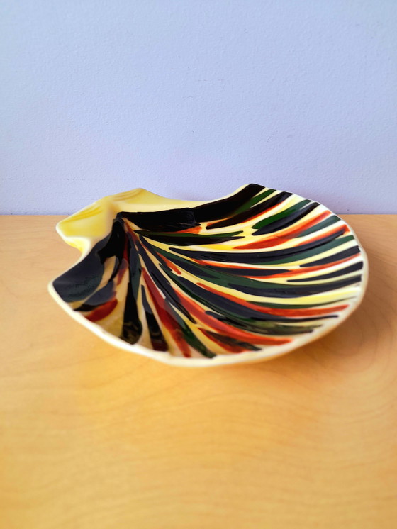 Questo portaoggetti a forma di conchiglia di San Clemente degli anni '60 è un pezzo dipinto a mano. I suoi colori vivaci e il design retrò aggiungono un tocco artistico a qualsiasi ambiente.