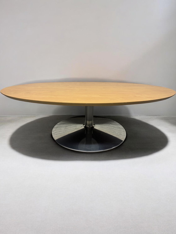 Valorizza il tuo spazio abitativo con questo raffinato tavolino da caffè di design Artifort, un perfetto connubio tra eleganza e funzionalità. Il piano ovale in legno, rifinito in una tonalità ciliegio chiaro, offre una superficie calda e accogliente che si adatta a qualsiasi arredamento.