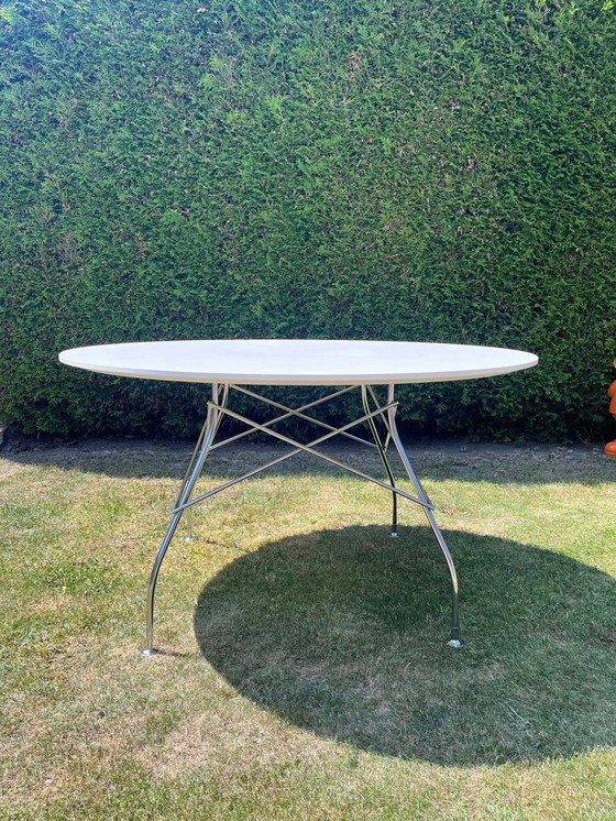 Tavolo da pranzo moderno ed elegante di Kartell, con piano bianco e gambe in metallo argentato. Il design del tavolo è al tempo stesso elegante e funzionale e lo rende un'aggiunta perfetta a qualsiasi spazio da pranzo contemporaneo. La struttura robusta garantisce una lunga durata, mentre la finitura lucida aggiunge un tocco di raffinatezza. Il designer è Antonio Citterio e Oliver Low.