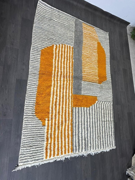 Immergiti nelle ricche texture e nelle tonalità vibranti di questo squisito tappeto marocchino in lana. Realizzato a mano con precisione, questo pezzo incarna l'essenza dell'artigianato tradizionale, offrendo al contempo un'estetica moderna che si adatta a qualsiasi arredamento.