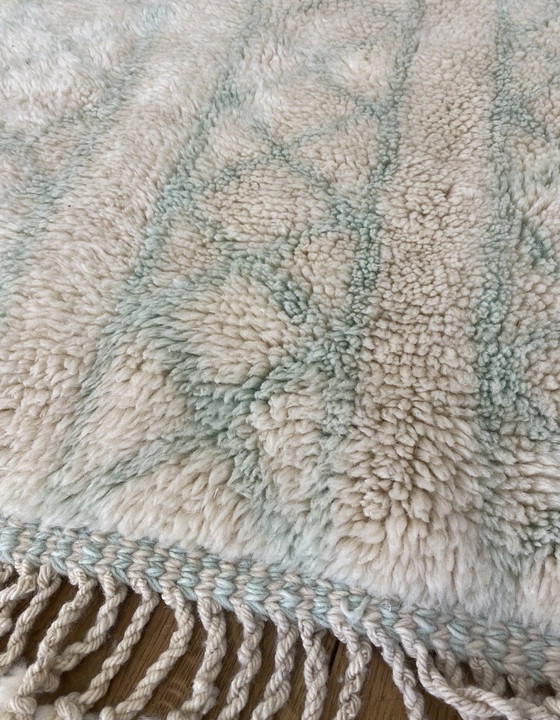 Nuovo e fatto a mano, questo tappeto berbero proviene dalla regione di Khenifra, l'unico luogo in cui vengono prodotti i lussuosi tappeti Beni Mrirt. Questi tappeti sono realizzati con lana eccezionalmente fine e vengono sottoposti a uno o due lavaggi dopo la tessitura. Questo conferisce loro una lucentezza delicata e sfumature di colore uniche. A causa dei passaggi aggiuntivi e dei nodi più fini, sono più costosi di un tappeto Beni Ourain standard. Questo tappeto in particolare presenta un delicato motivo in turchese sbiadito e una splendida decorazione su entrambe le estremità. È un pezzo davvero unico.
