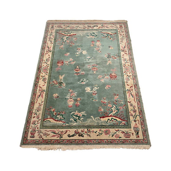 Tappeto cinese vintage degli anni '60/'70. Questo affascinante e decorativo tappeto cinese presenta una palette di colori tenui ed elementi tipici della tradizione cinese. Presenta qualche segno di usura lungo i bordi e nelle zone decorative.