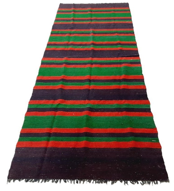 Vi presentiamo un tappeto passatoia vintage a righe che emana un'eleganza e un fascino senza tempo. Questo splendido pezzo, realizzato in lana di alta qualità, presenta una vivace palette di righe verdi, rosse e nere, che lo rendono un'aggiunta sorprendente a qualsiasi corridoio o soggiorno.