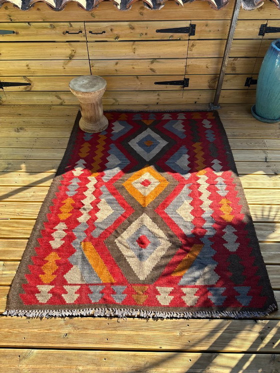 Magnifico e autentico tappeto kilim turco vintage annodato a mano. Lana e cotone. Una splendida combinazione di colori e tonalità che aggiungerà senza dubbio un tocco di calore a qualsiasi interno. Questo tappeto e gli altri due elencati nel mio profilo sono stati sapientemente abbinati a mobili scandinavi e lampade francesi d'epoca; il risultato è stato perfetto. È stato utilizzato e curato meticolosamente fin dal suo acquisto da parte del precedente proprietario. È in condizioni eccellenti e i colori sono vivaci come il giorno in cui è stato realizzato. Raro. Dimensioni: 145 x 200 cm