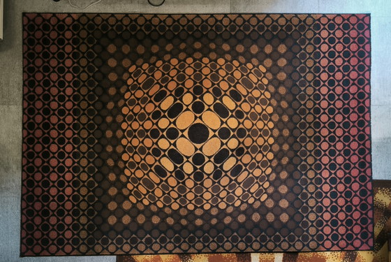 Tappeto vintage in stile Vasarely - 160 × 230 cm Vendesi un elegante tappeto vintage nell'iconico stile Op Art, ispirato a Victor Vasarely. Il motivo geometrico 3D nelle calde tonalità del marrone, arancione e rosso aggiunge una speciale profondità e dinamismo a qualsiasi stanza. Dimensioni: 160 × 230 cm Condizioni: Ottime condizioni Stile: Op Art / Geometrico / Estetica anni '70 Caratteristiche speciali: Design unico, ispirato alle opere di Vasarely