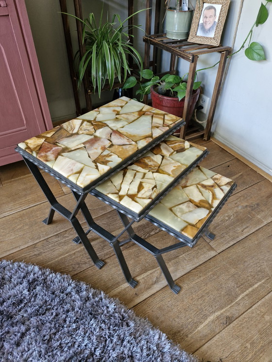 Questi tavolini vintage impilabili sono una splendida aggiunta a qualsiasi arredamento. Presentano un esclusivo piano in pietra con motivo a mosaico nei toni caldi del marrone e del crema. La struttura in metallo fornisce una base robusta e aggiunge un tocco industriale. Perfetti come tavolini laterali o elementi decorativi in soggiorno. Il tavolino centrale presenta alcuni segni sul piano, ma non fastidiosi.