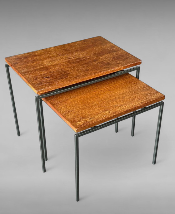 Questi tavolini vintage di Cees Braakman, risalenti agli anni '60, sono un meraviglioso esempio di design di metà secolo. I tavolini hanno un'elegante struttura in metallo e un piano in legno, creando un look senza tempo. Perfetti per gli amanti dei mobili vintage, questi tavolini aggiungono un tocco di fascino retrò a qualsiasi ambiente.