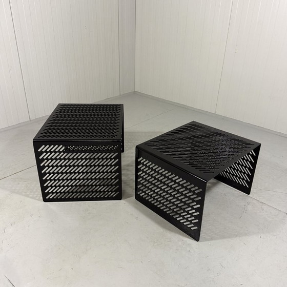 Tavolini laterali in acciaio forato nero, Italia, anni '80