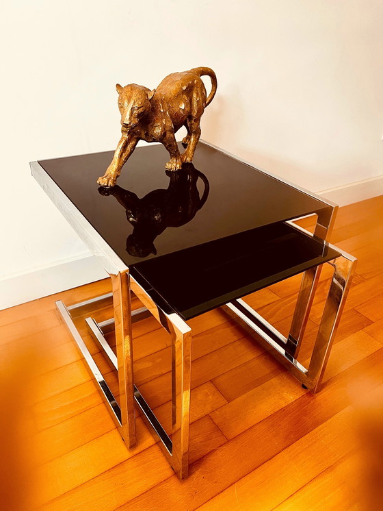 🖤 Tavolini Neri 🖤 Wow, che look speciale questo set di 2 tavolini. Uno dietro l'altro, uno sotto l'altro, ma anche separatamente. L'aspetto cromato con vetro nero è totalmente anni '80. Questo look lo rende anche immediatamente elegante in qualsiasi interno 😍 Questo tavolo anni '80 è un tipico look dello stile cromato anni Settanta che appartiene a Jaimy Chrome. Grande: H: 41 W: 43 L: 45 Piccolo: H: 35 W: 36 L: 45
