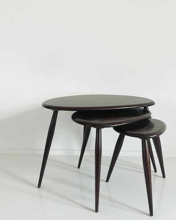 Questo set di tre tavolini Ercol è un classico senza tempo con forti radici nell'artigianato britannico di metà secolo. Progettato originariamente da Lucian R. Ercolani negli anni '50, è da allora diventato uno dei pezzi più riconoscibili della collezione Ercol.