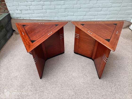 Scopri i tavolini Andrew di Schuitema, una splendida coppia che incarna l'eleganza del design Art Déco. Questi tavolini sono realizzati con precisione e presentano una finitura in legno marrone, ricca, calda e invitante. La forma triangolare aggiunge un tocco geometrico unico, rendendoli un'aggiunta perfetta a qualsiasi spazio abitativo elegante.
