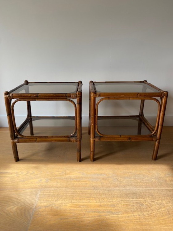 Tavolini laterali vintage in rattan (2) vetro fumé