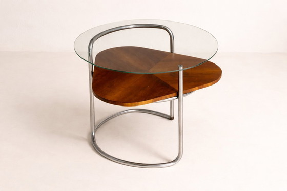 Tavolino a due ripiani prodotto tra gli anni '30 e '40, che riflette i principi del design funzionalista e Bauhaus del periodo modernista tra le due guerre. Il pezzo enfatizza le linee pulite e un uso equilibrato di materiali industriali.